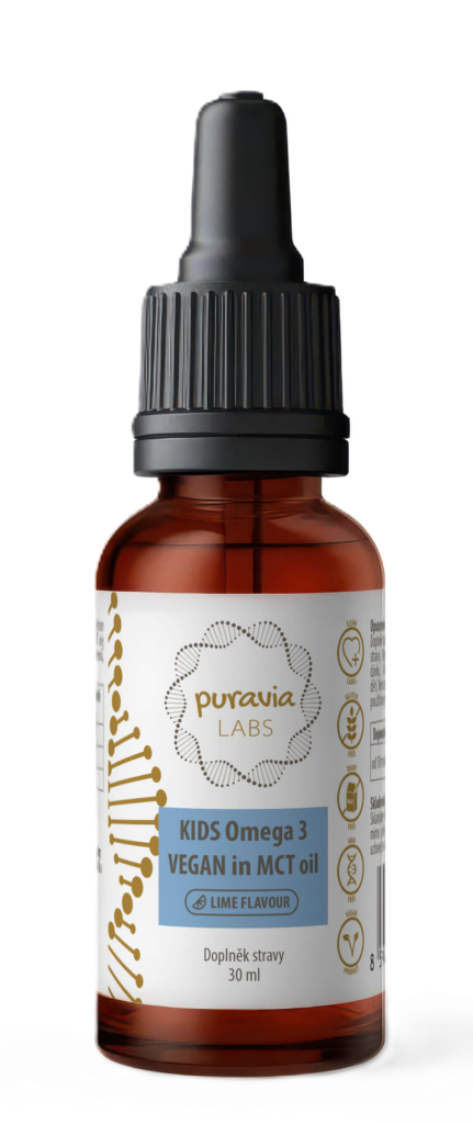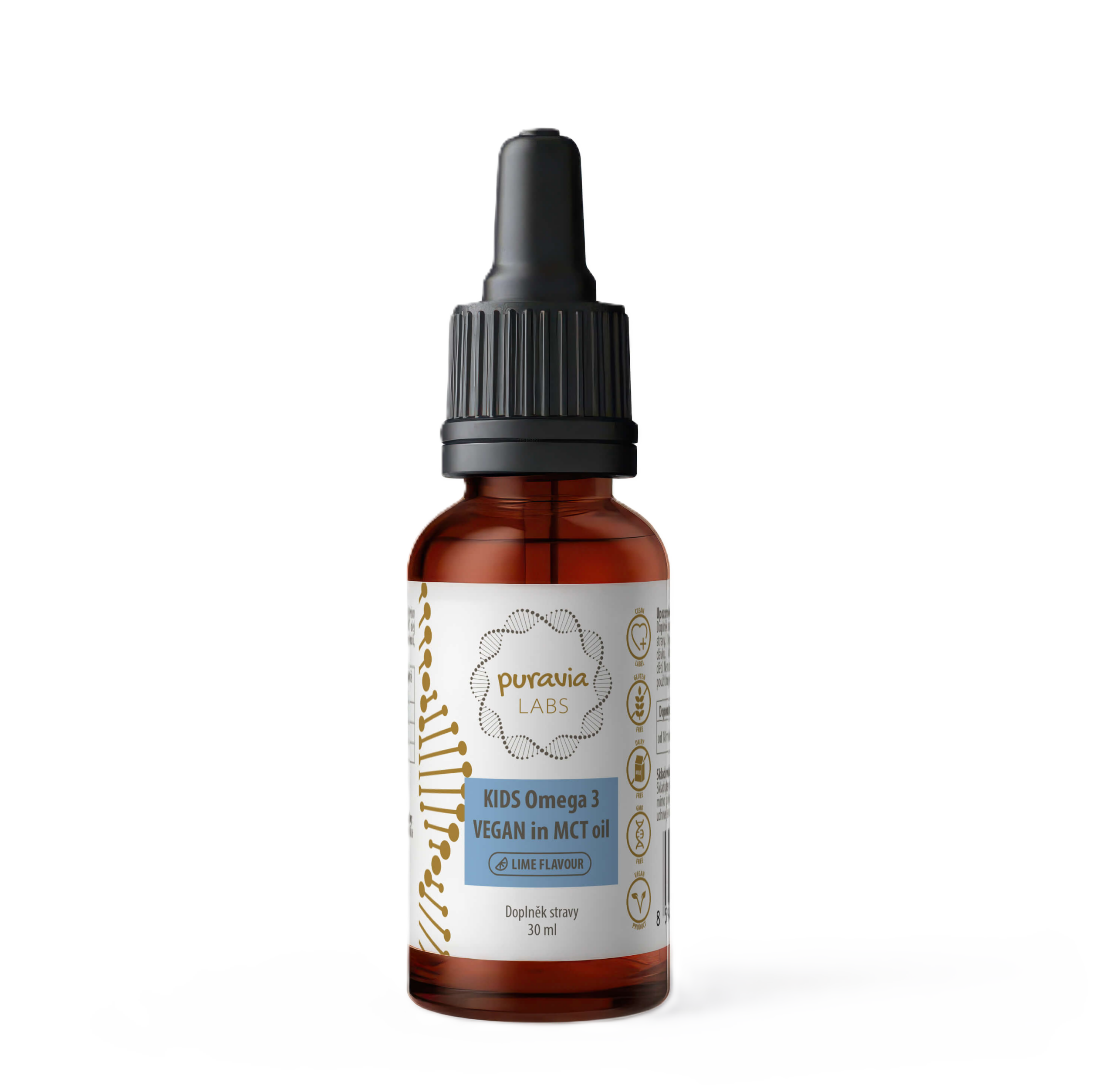 Puravia LABS Kids Omega-3 Vegan je prémiový doplněk stravy pro děti od 18 měsíců vytvořený s důrazem na kvalitu a účinnou vstřebatelnost. Obsahuje omega-3 mastné kyseliny DHA a EPA z mikrořas Schizochytrium sp., zcela veganské a rozpuštěné v kokosovém MCT oleji pro jednoduché a přesné dávkování.